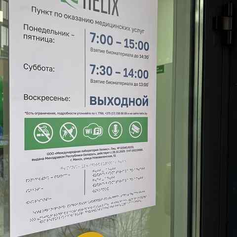 Международная медицинская лаборатория HELIX (ХЕЛИКС) выполняет более 1 500 исследований для диагностики организма и отслеживания состояния здоровья: от общих анализов до сложных генетических тестов. Сеть включает более 60-ти отделений по всей Беларуси, что может позволить пациентам выбрать ближайший центр медицинских анализов. Также доступна выездная служба для удобного забора биоматериала.